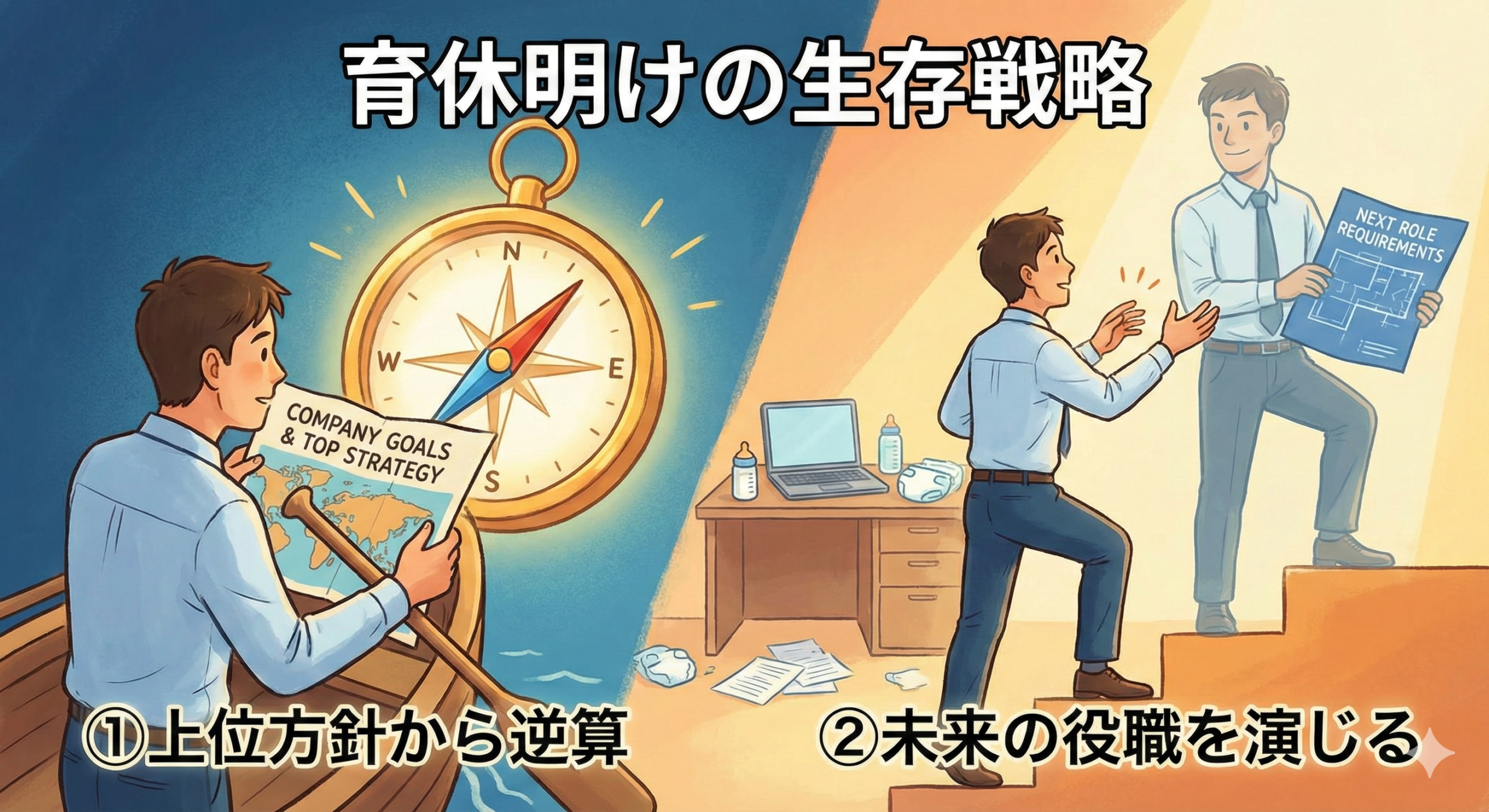 今日のブログは、単なる一個人の評価面談の顛末記ではありません。育休を取得した、あるいはこれから取得しようとしているパパ・ママ。キャリアの踊り場に立ち、今後の昇進や評価に漠然とした不安を抱えているビジネスパーソン。そんなすべての方々にとって、明日からの働き方が少し変わるかもしれない、「2つの生存戦略」について、僕自身の経験を交えながら、できる限り具体的にお話ししたいと思います。
